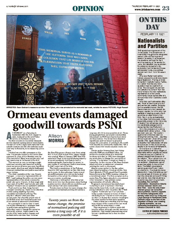 Summary: On This Day – 11th February 1921, A Times of London commentator warned Partition would exclude Nationalists from power, questioned Joe Devlin’s leadership, and doubted whether Catholics would receive equal citizenship under the new Northern Parliament. Edited by Éamon Phoenix.