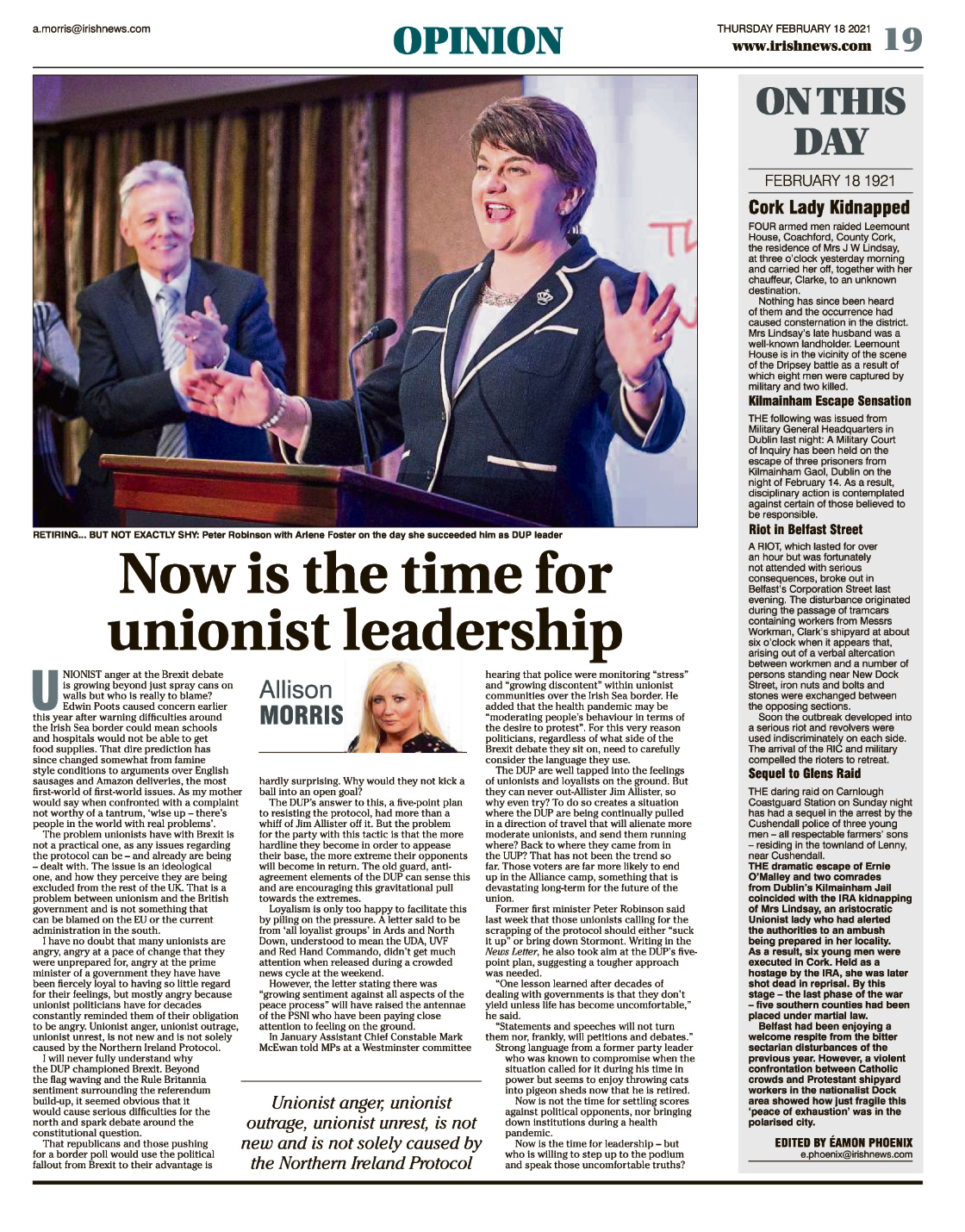 Summary: On This Day – 18th February 1921, wealthy widow Mrs Lindsay was kidnapped in Cork, prisoners escaped from Kilmainham Gaol, Belfast rioted in Corporation Street, and arrests followed the Carnlough coastguard raid. Edited by Éamon Phoenix.