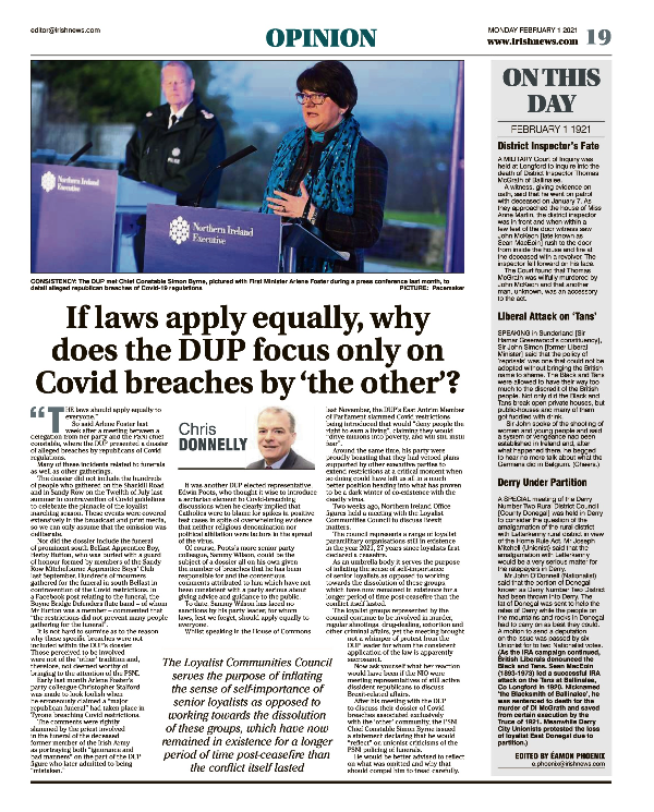 Summary: On This Day – 1st February 1921, a court ruled District Inspector Thomas McGrath was murdered in Longford, British Liberals condemned Black and Tan reprisals, and Derry Unionists protested administrative changes under Partition. Edited by Éamon Phoenix.