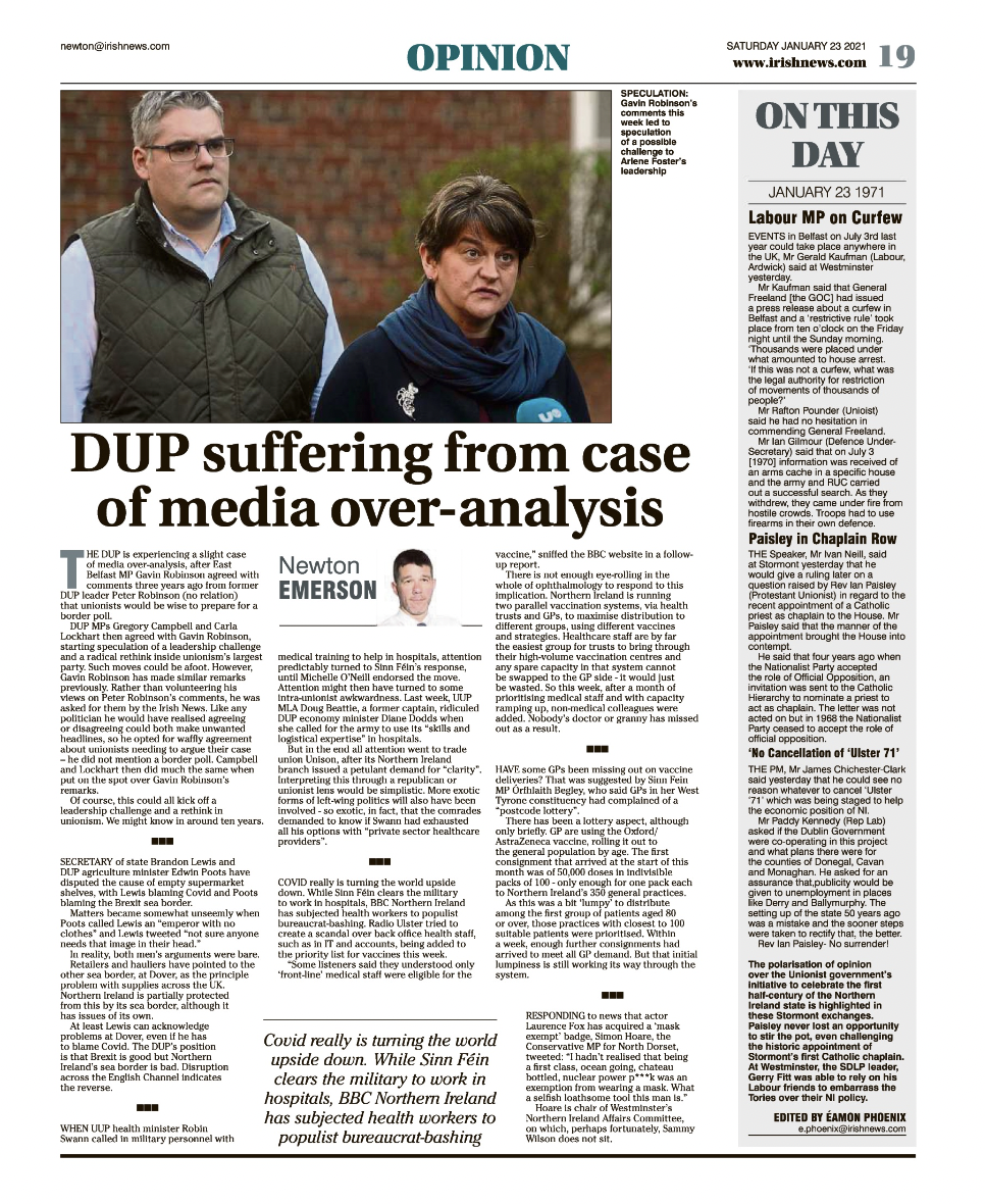 Thumbnail of PDF of Irish News page containing the Eamon Phoenix On This Day column dated 23.01.2021, detailing events reported on 23.01.1921