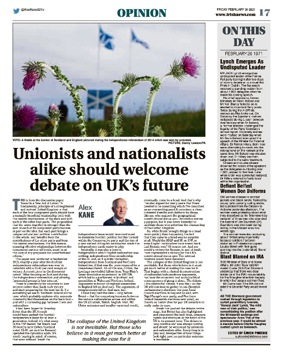 Summary: On This Day – 26th February 1971, Jack Lynch consolidates control of Fianna Fáil after stormy scenes in Dublin, Belfast women march in combat jackets, and Stormont debates revisit the Brougher Mountain BBC mast bombing massacre. Edited by Éamon Phoenix.