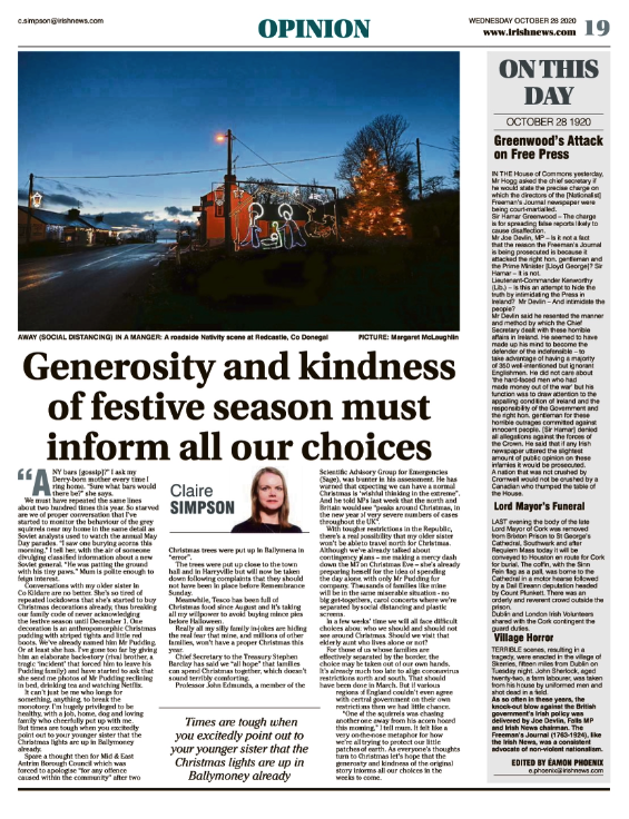 Summary: On This Day – 28th October 1920, Joe Devlin clashed with Sir Hamar Greenwood in the Commons over the prosecution of the Freeman’s Journal, while the body of Cork’s Lord Mayor Terence MacSwiney was removed from Brixton Prison for burial. Edited by Dr Éamon Phoenix.