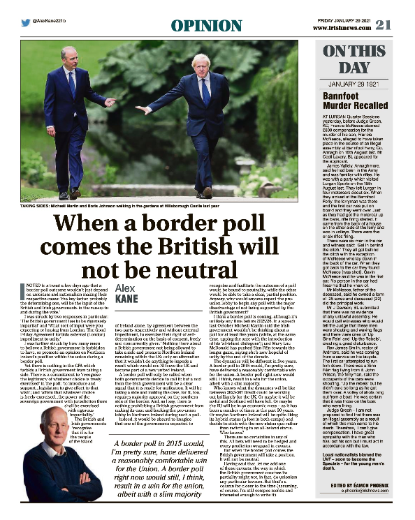 Thumbnail of PDF of Irish News page containing the Eamon Phoenix On This Day column dated 29.01.2021, detailing events reported on 29.01.1921