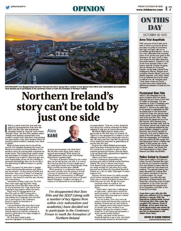 On This Day is a daily column in the Irish News looking back either 50 or 100 years. The column was compiled by Dr Éamon Phoenix from the mid 1980s until autumn, 2022. The Foundation is very grateful to the Irish News for giving permission to reproduce Eamon’s columns. Funding gratefully received from Ireland’s Department of Foreign Affairs and the Magill Trust.
