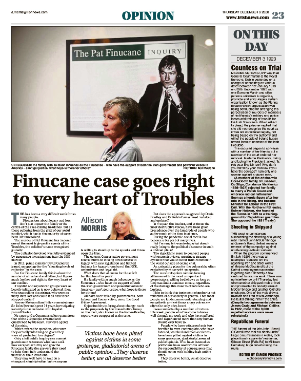 Summary: On This Day – 3rd December 1920, Countess Markievicz faced court-martial in Dublin as Belfast saw renewed anti-Catholic shipyard attacks and crowds gathered for Sean O’Carroll’s republican funeral.