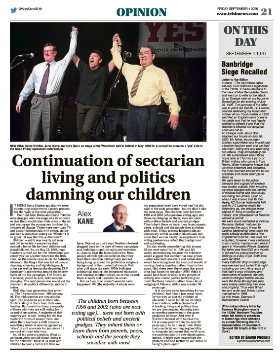It made reference to the case of Miss Bernadette Devlin and went on to refer to the attack by an Orange mob on our house in Banbridge on the evening of July 29, 1920. The purpose of the letter was to point out that Mr J C Lardner, counsel defending my father and brother at our Court-martial in 1920, said that an Englishman’s home is his castle and that he was legally entitled to defend it and that this statement effected our acquittal.