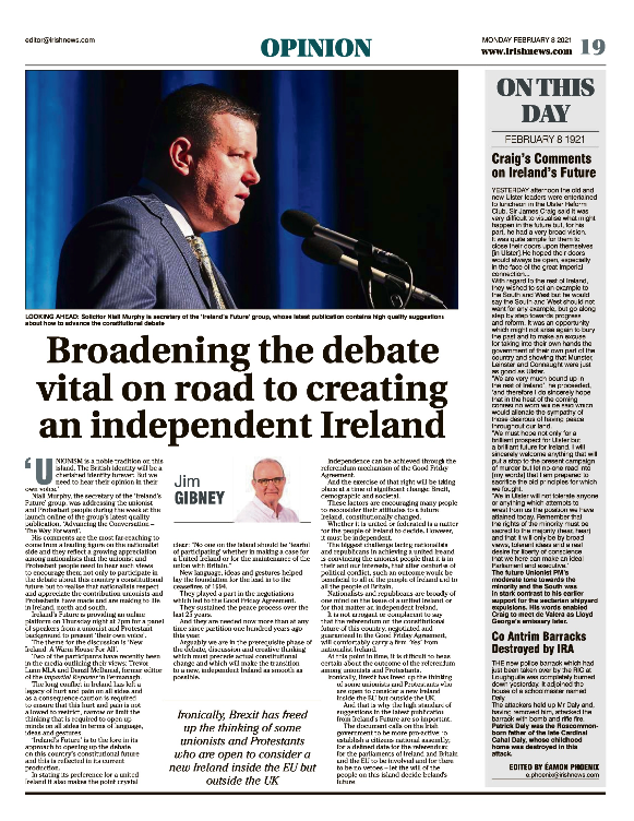 Thumbnail of PDF of Irish News page containing the Eamon Phoenix On This Day column dated 8th February 2021, detailing events reported on 8th February 1921